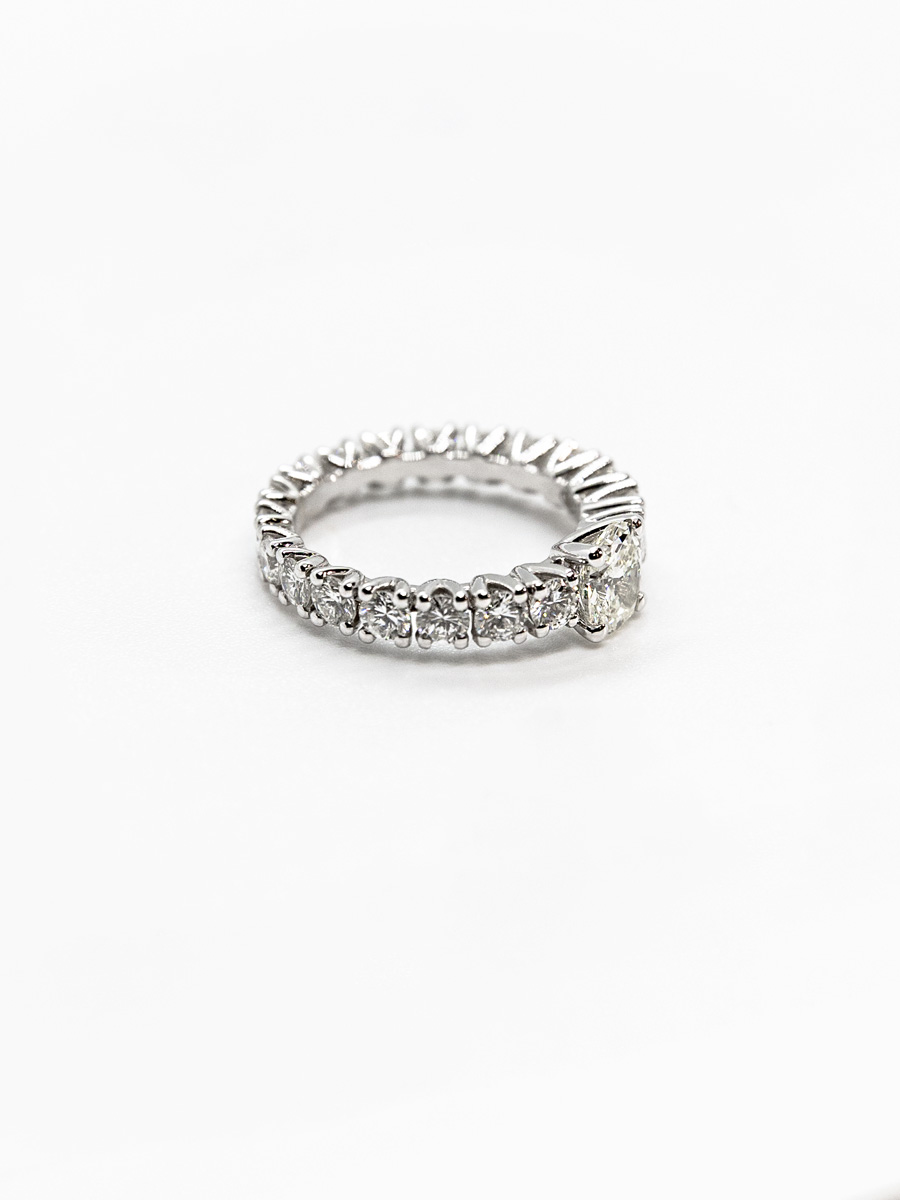 Lo smeraldo centrale, taglio brillante, e i diamanti laterali donano luce e raffinatezza ad ogni mano.