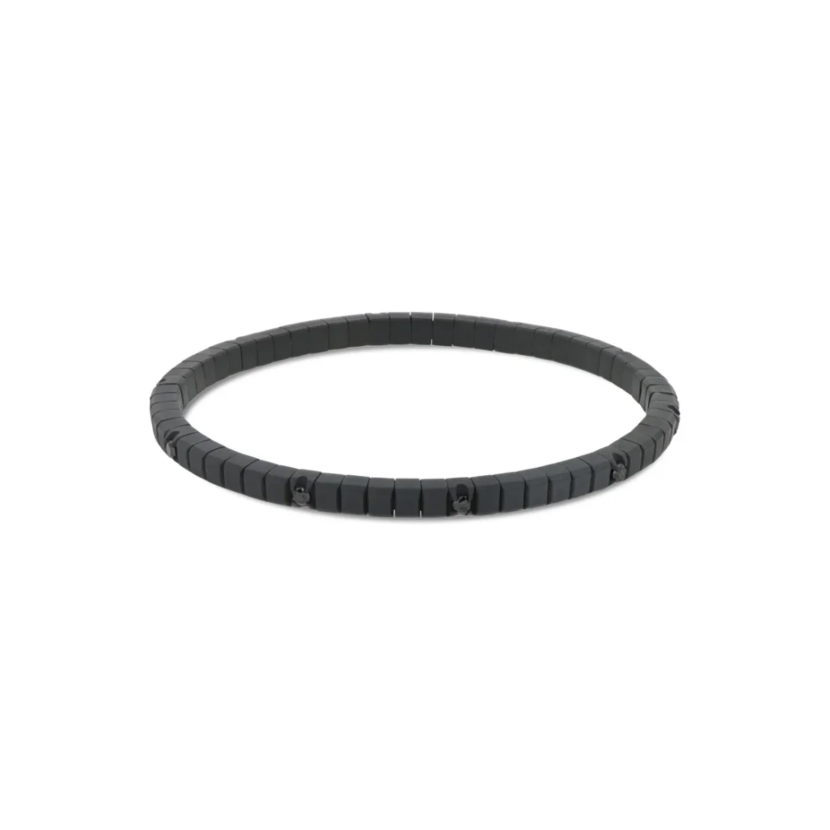 Realizzato in titanio nero, materiale resistente, leggero e confortevole, il bracciale si distingue per la sua struttura elastica che garantisce una vestibilità perfetta e pratica, senza rinunciare allo stile. Il design è impreziosito da 10 diamanti black da 5 punti, che donano luminosità e carattere, creando un effetto elegante e deciso.