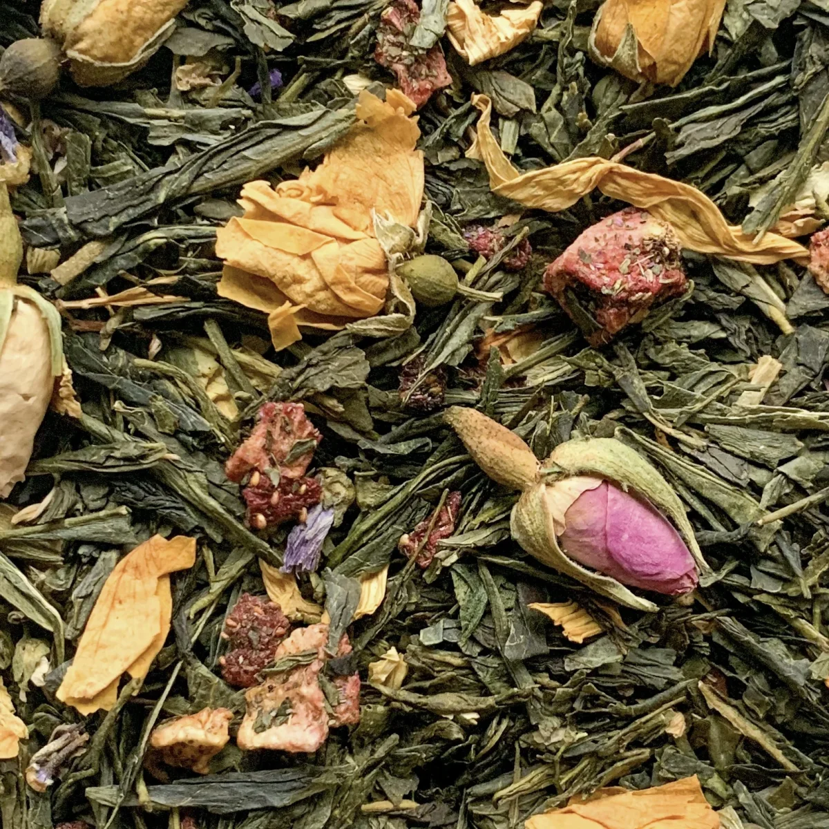 Ingredienti: tè verde, aroma (lampone), pezzetti di fragola, boccioli di rosa, fiori di malva, petali di girasole.