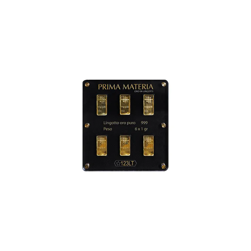 6 Lingotti in oro con una purezza di 999 parti su 1000 di oro puro, da 1gr ciascuno, con purezza e peso riportati sul lingotto stesso. Sigillati in blister, sono custoditi in una confezione elegante nera e oro, con uno specchio inciso, nella quale è presente il certificato del prodotto.