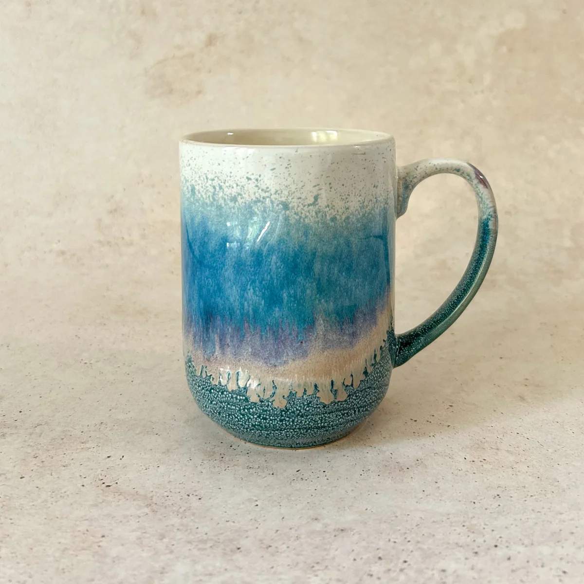 La Tazza Orizzonte è pensata per chi ama perdersi in una tazza grande, davvero grande: quasi mezzo litro di spazio per tè, tisane o tutto ciò che fa sentire a casa. In questa variante porta con sé la calma dei colori profondi: un blu che scende verso il turchese, sfumando nel beige e in leggere colature che sembrano piccole onde sulla sabbia.